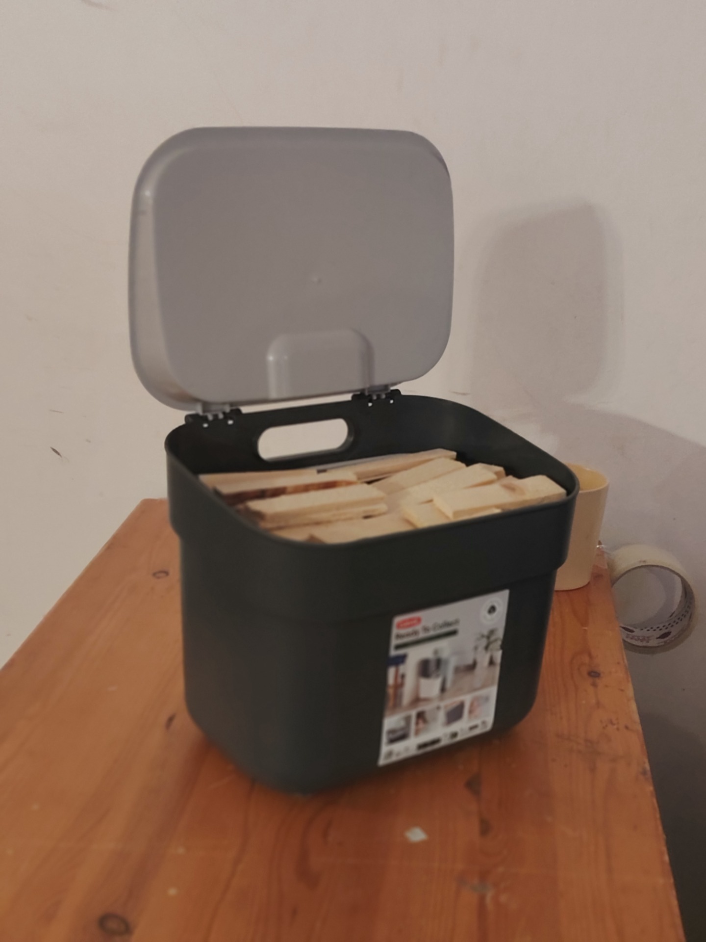 Pieni biojäteastia, jonne mahtu 200 tikkua .