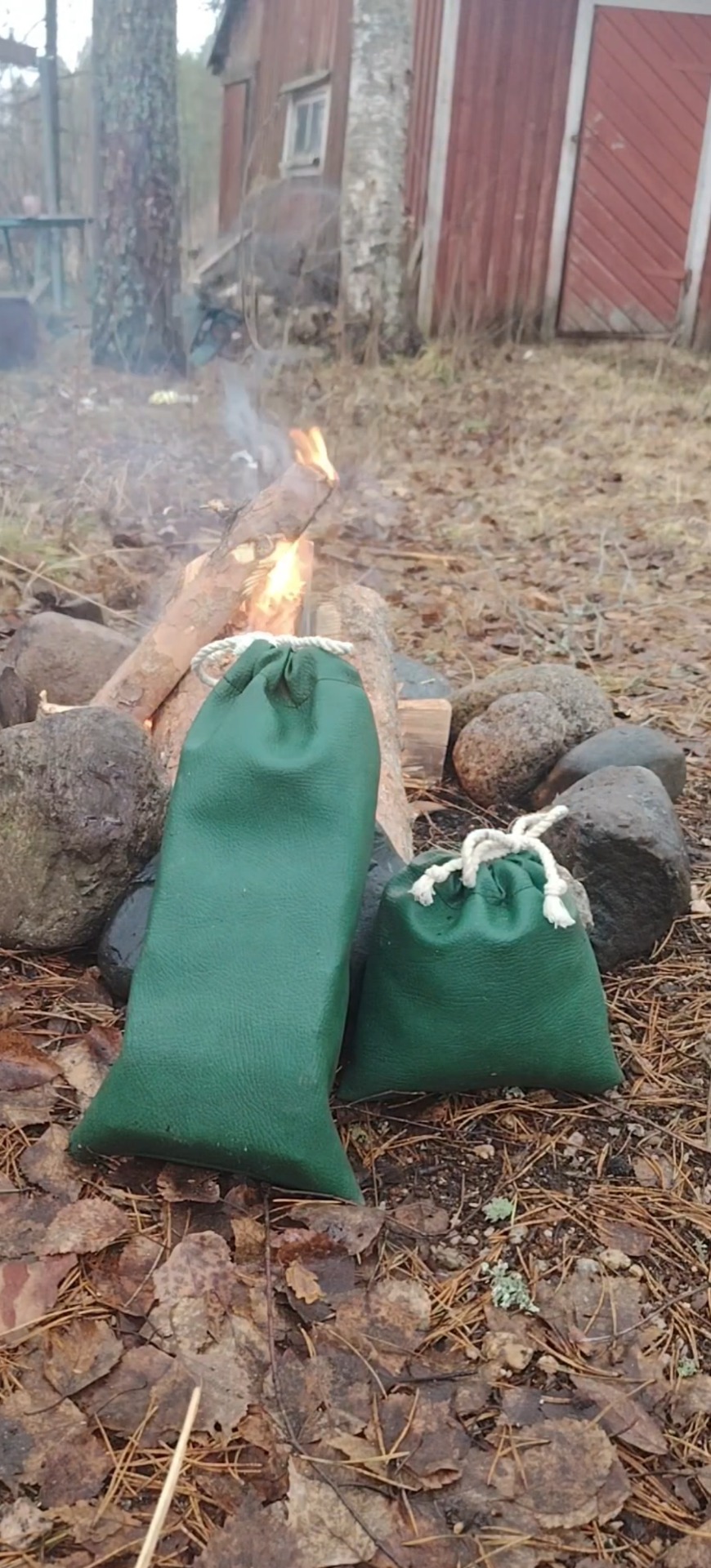 Nahkainen pussukka, jossa sisällä kaksi pienempää nahkapussukkaa.