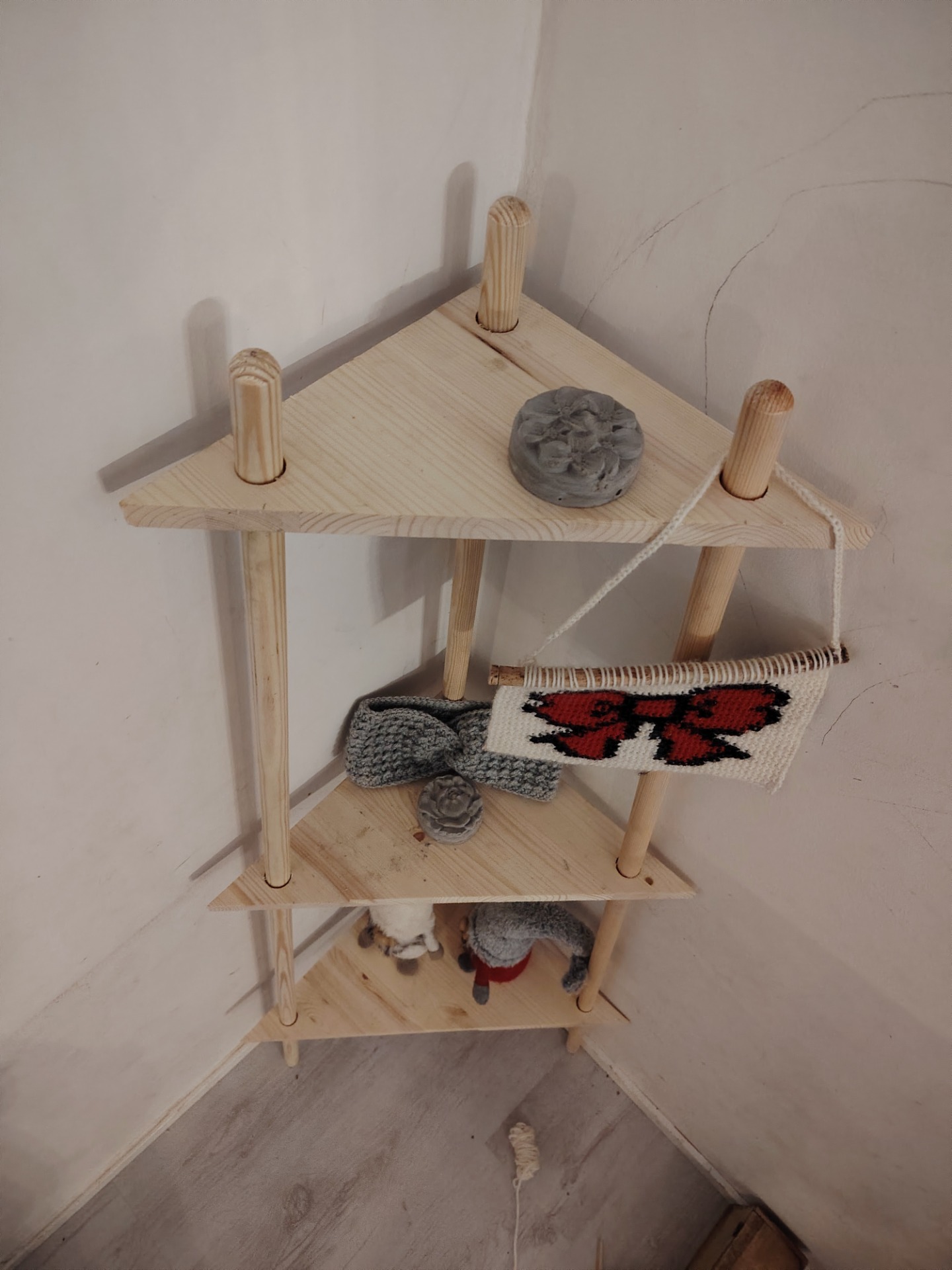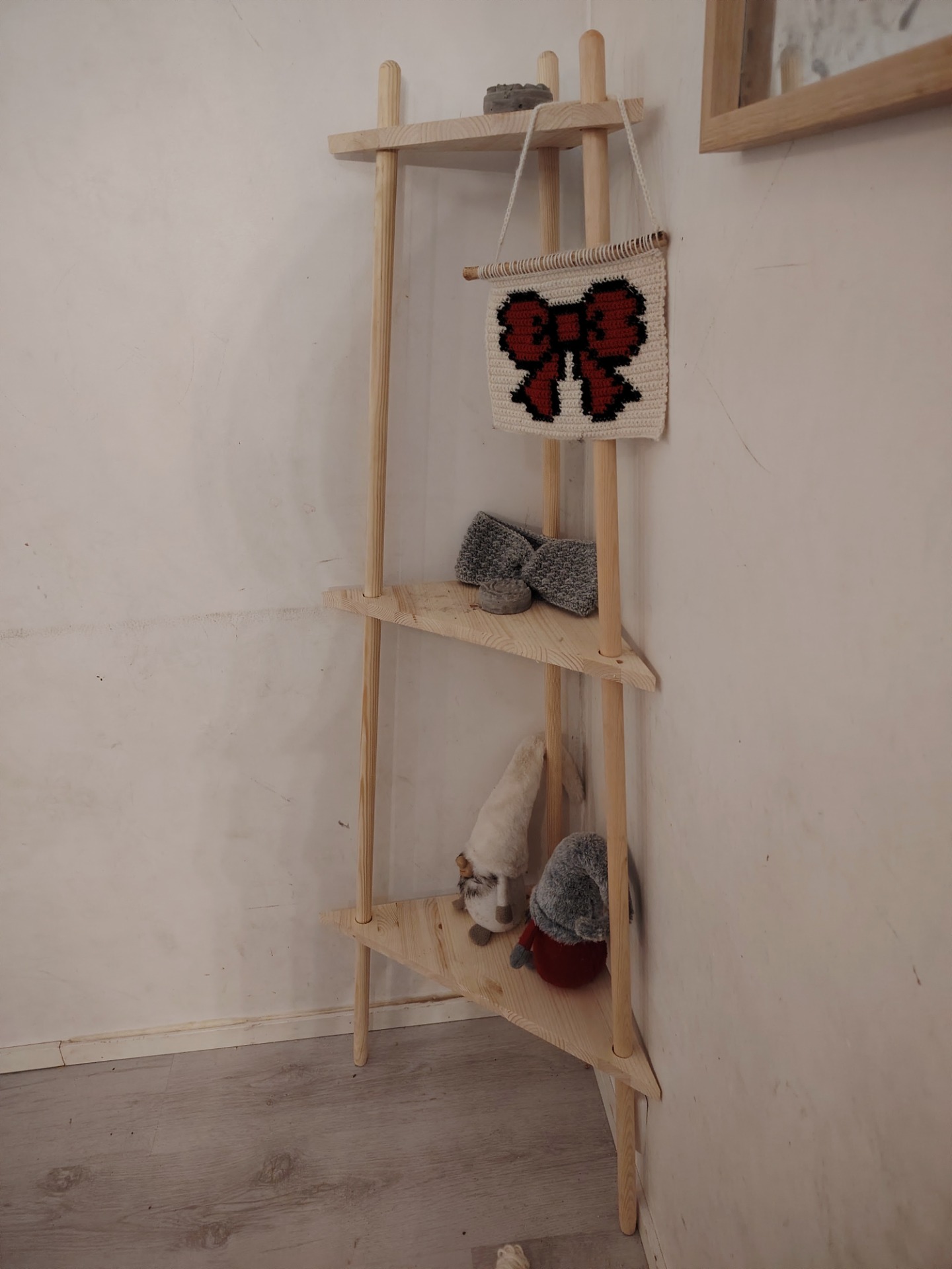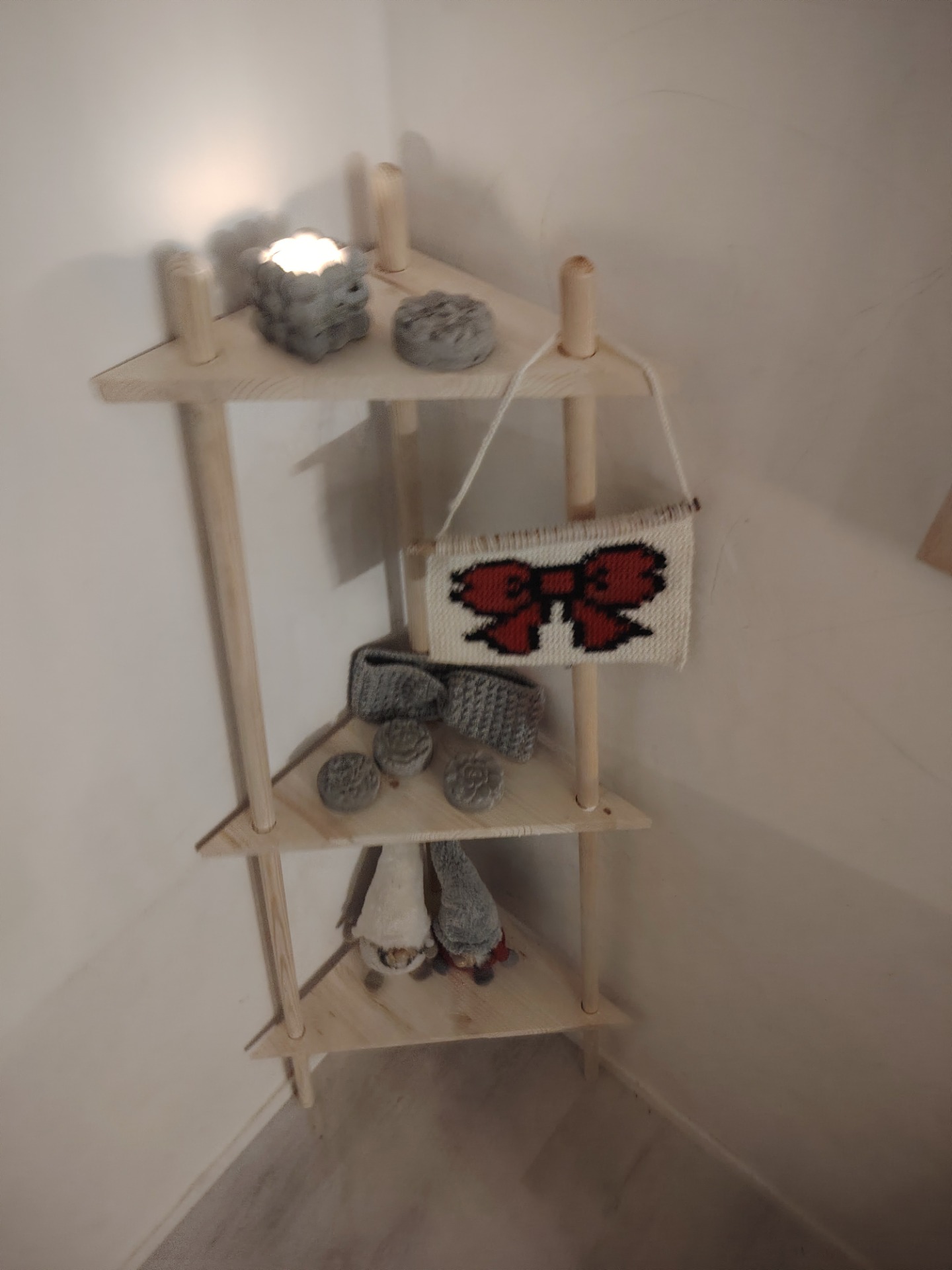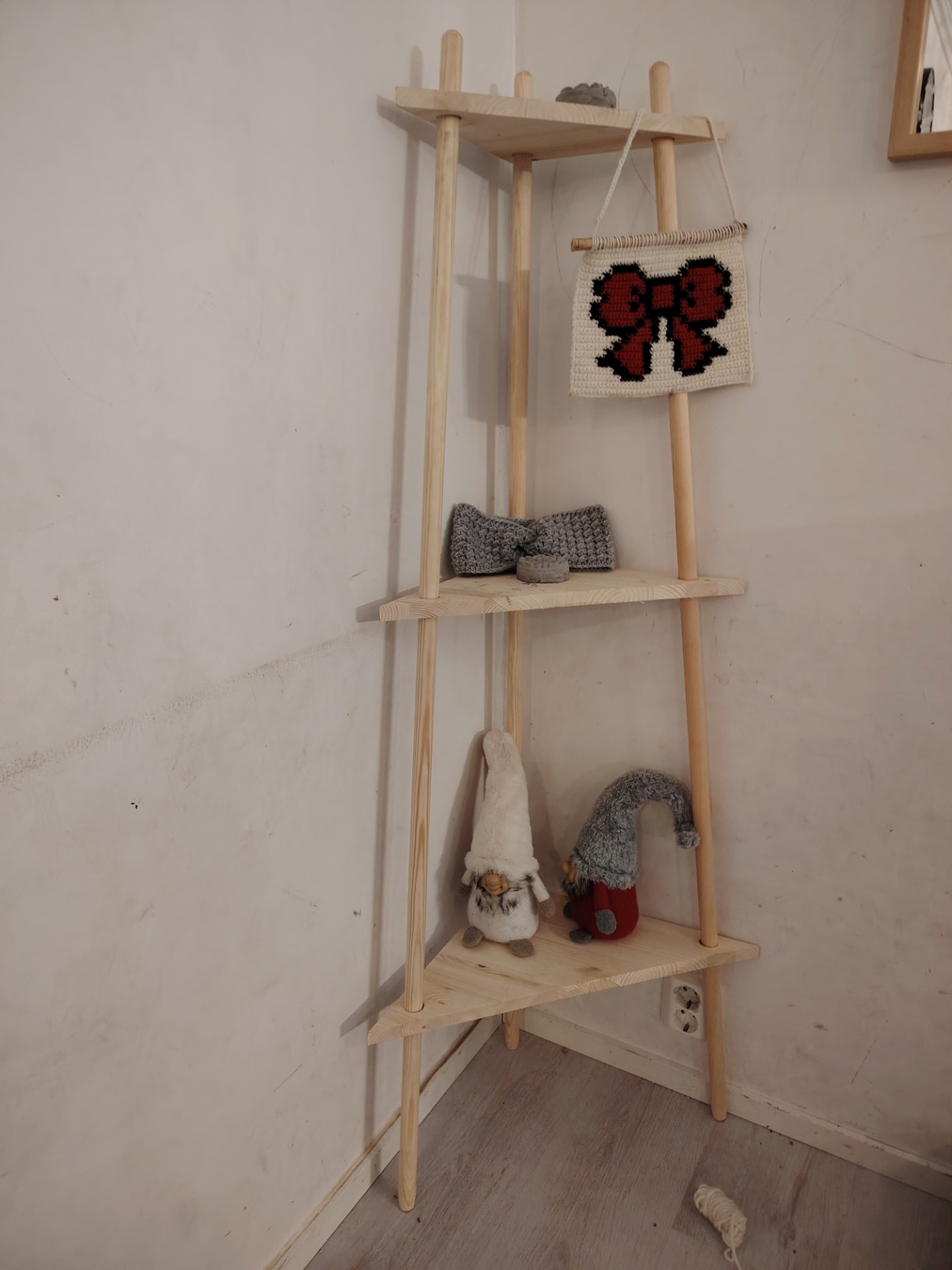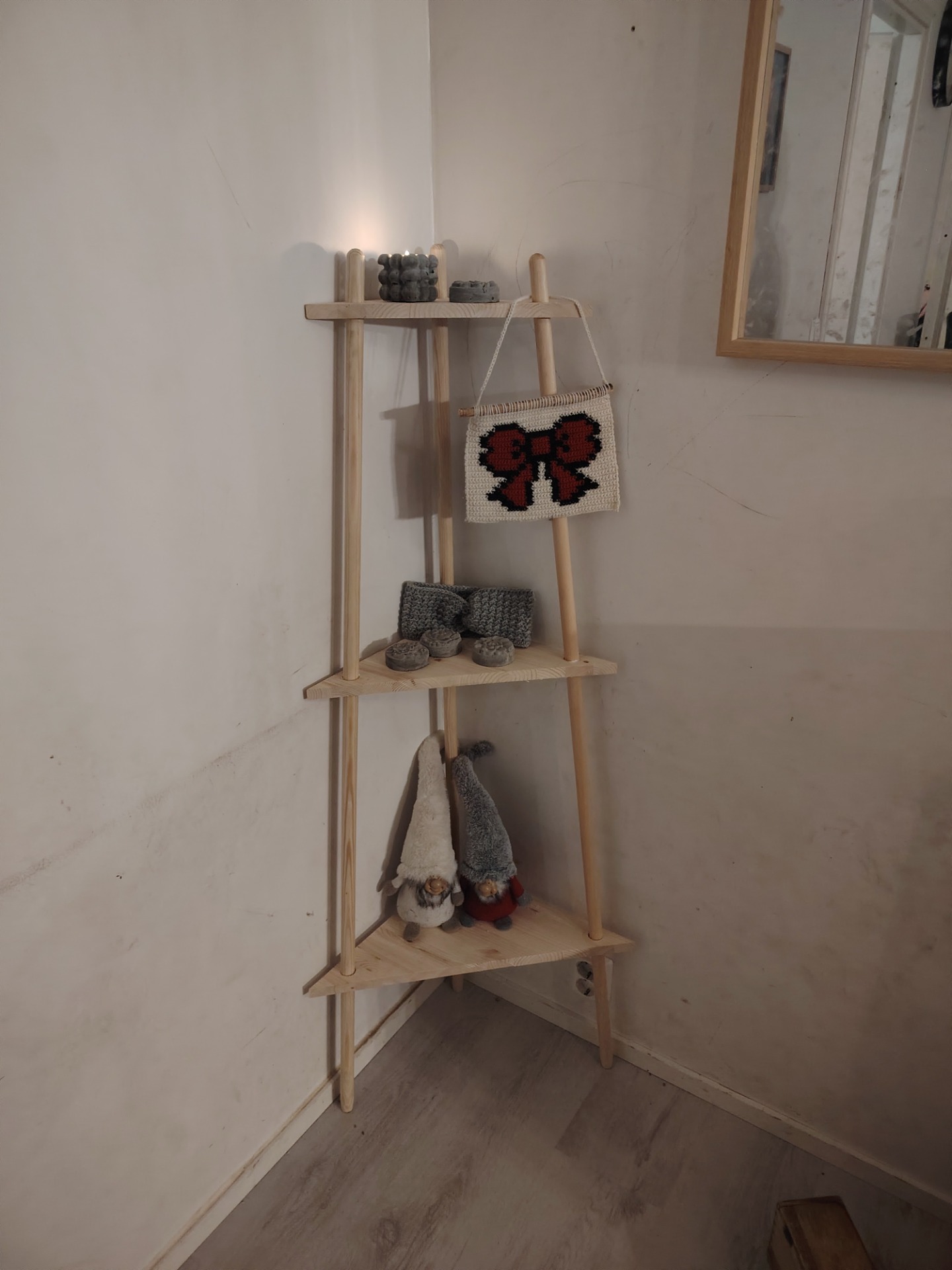 Kulmahylly, jossa hyllyt pienenee ylöspäin. Alin hylly 56cm leveä ja 24cm syvä ja ylin hylly 48cm leveä ja 16cm syvä. hyllyjen väli 50.5cm