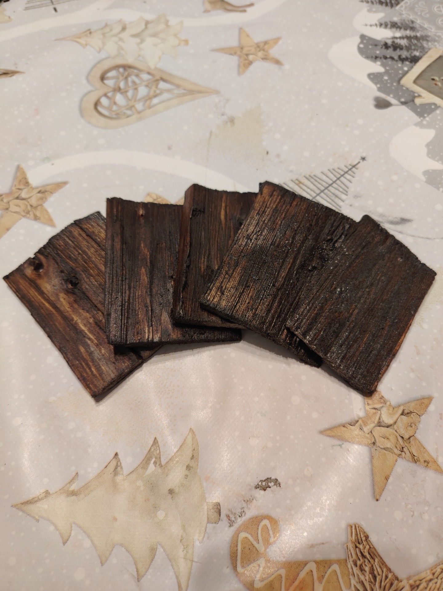 tervassa keitettyjä lastuja n. 9cm x 6cm ja paksuus 3mm-10mm väliltä. Erittäin voimakkaan tervan tuoksuisia sytykkeitä